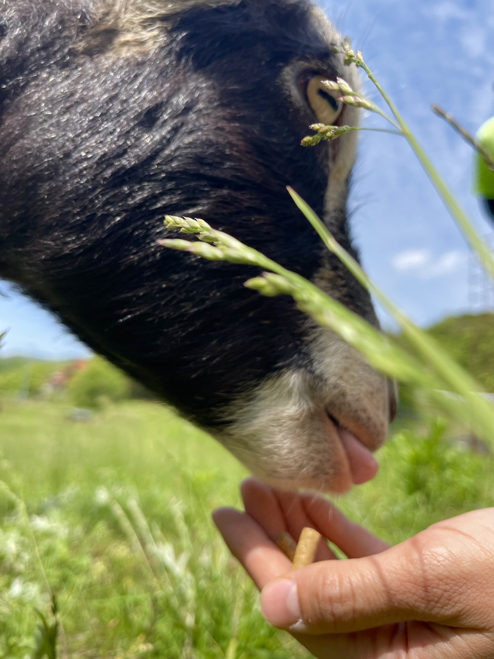 小学生のころは生き物係をするほど、昔から動物たちのお世話が大好きだったという割方さん。敷地内の除草目的でヤギを飼い始め、その魅力を多くの方々に知ってもらい、みなさんの除草のお手伝いもしてもらおうと、今年4月に牧場として本格的にスタートしたそうです☀